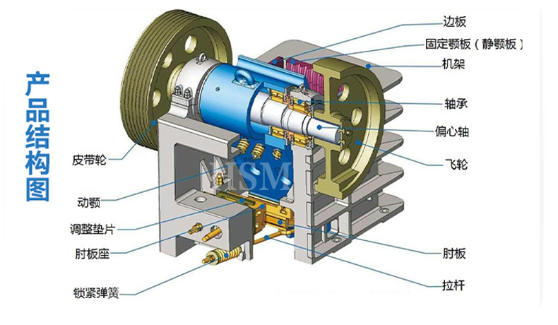 鄂式破石機破碎方式為曲動擠壓型,電動機驅(qū)動皮帶和皮帶輪,通過偏心軸使動顎上下運動,當(dāng)動顎上升時肘板與動顎間夾角變大,從而推動動顎板向固定顎板接近,與其同時物料被壓碎或劈碎,達(dá)到破碎的目的;